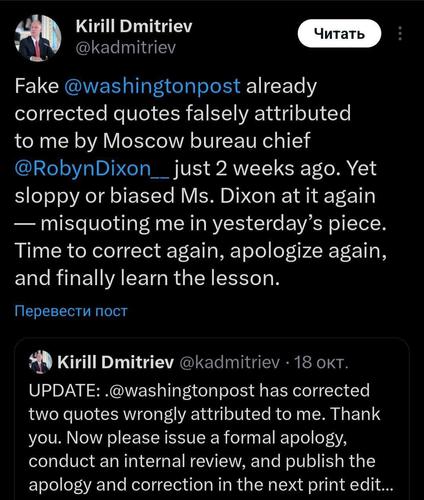Спецпредставитель президента РФ Кирилл Дмитриев подаёт иск против американской газеты за неоднократное искажение его слов в публикациях. Издание сначала приписало главе РФПИ вымышленные цитаты, затем частично исправило материал, но уже на следующий день снова опубликовало ложные формулировки.
