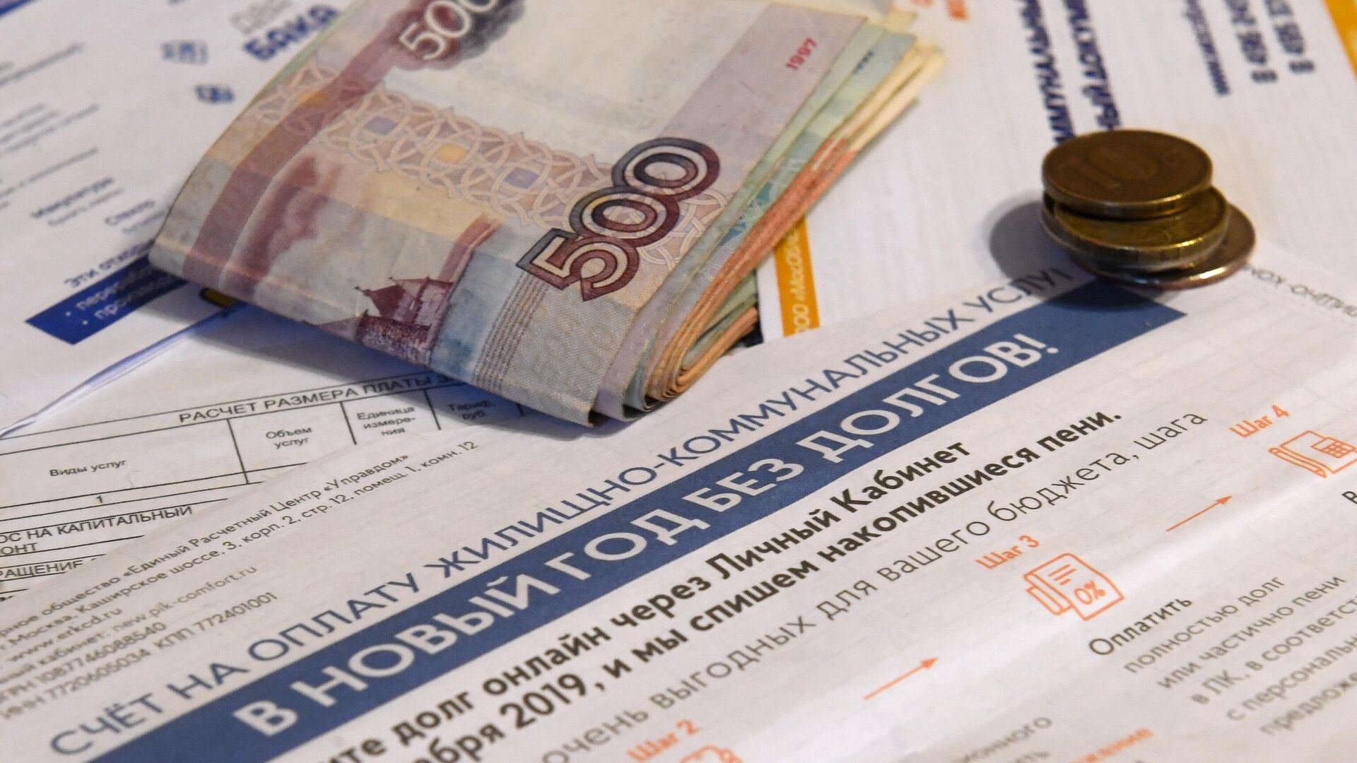 Денежные купюры и квитанции за оплату коммунальных услуг. Архивное фото Дзен